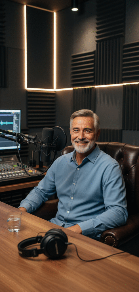 Com qualquer IA coloque seu pai em um cenário de podcast (microfone, mesa, luz quente). Por exemplo, a Perplexity transporta o avatares para qualquer ambiente com fundos virtuais e ajudam nessa etapa e inspiram estilos.