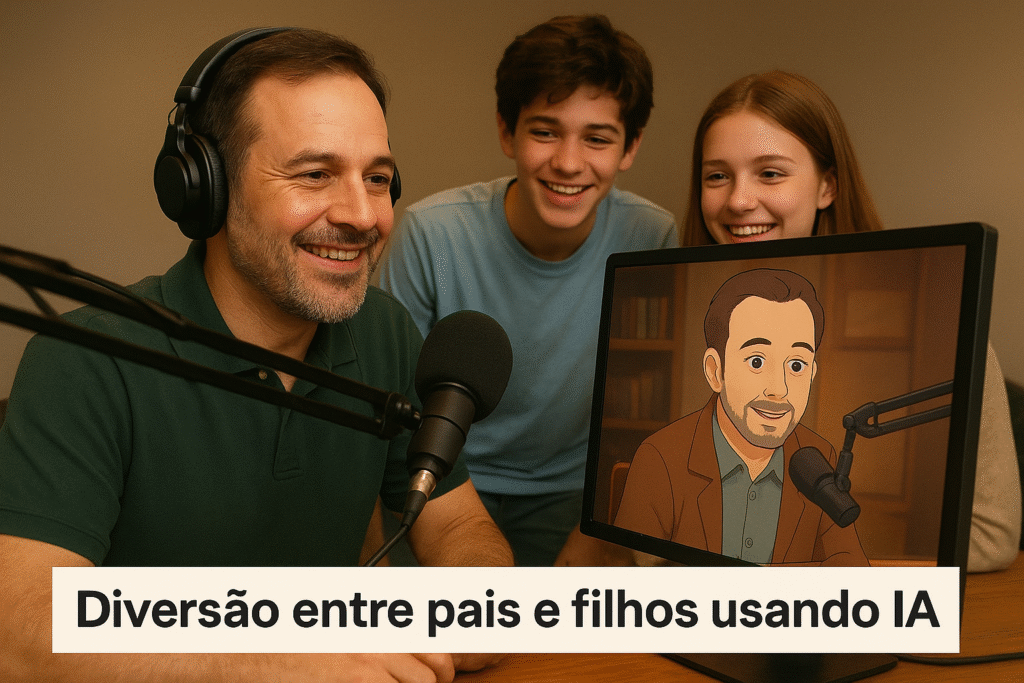 A diversão entre pais e filhos usando IA é ponte entre gerações. Em poucas etapas, o PodPai vira vitrine de IA conectando gerações, com pais e filhos aprendendo IA em conjunto e celebrando resultado criativo.